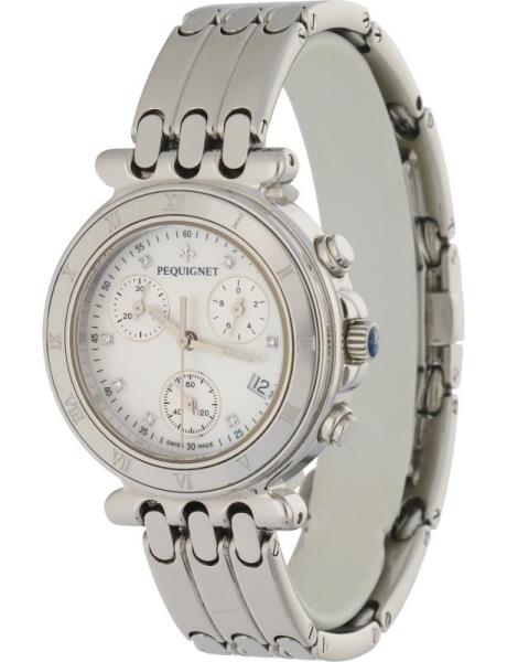 PEQUIGNET MOOREA DAMES HORLOGE, EDELSTAAL MET CHRONOGRAAF QUARTZ UURWERK , PARELMOER WIJZERPLAAT MET 7 DIAMENTEN , KRASBESTENDIG SAFFIERGLAS