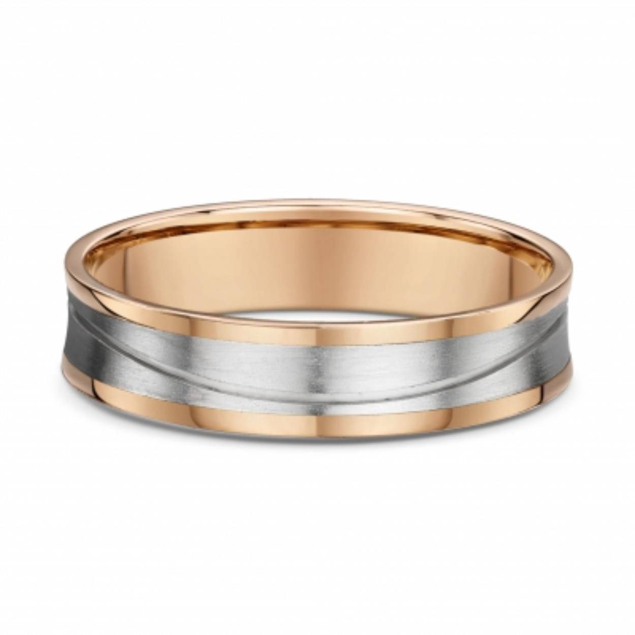 14 karaat wit/rosegouden trouwringen. De damesring is gezet met in totaal 0.03crt diamant