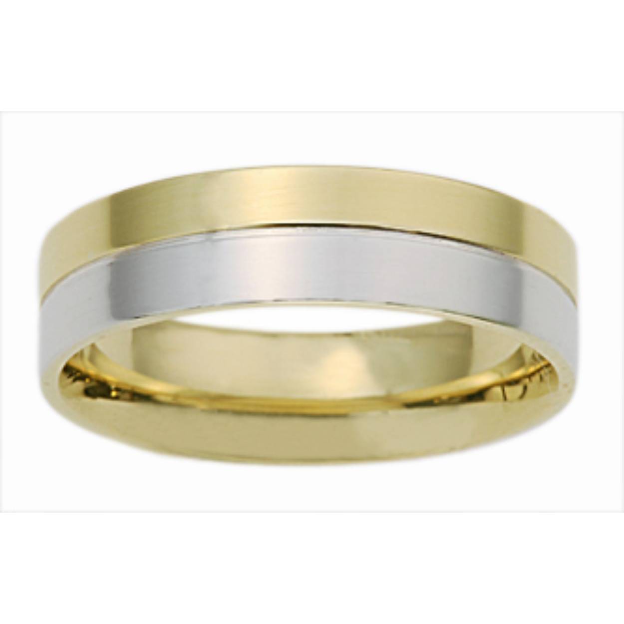 585 bicolor trouwringen geel/witgoud. 6.2 mm breed. Glanzend. De damesring is gezet met totaal 0.095ct briljant 11 steens.