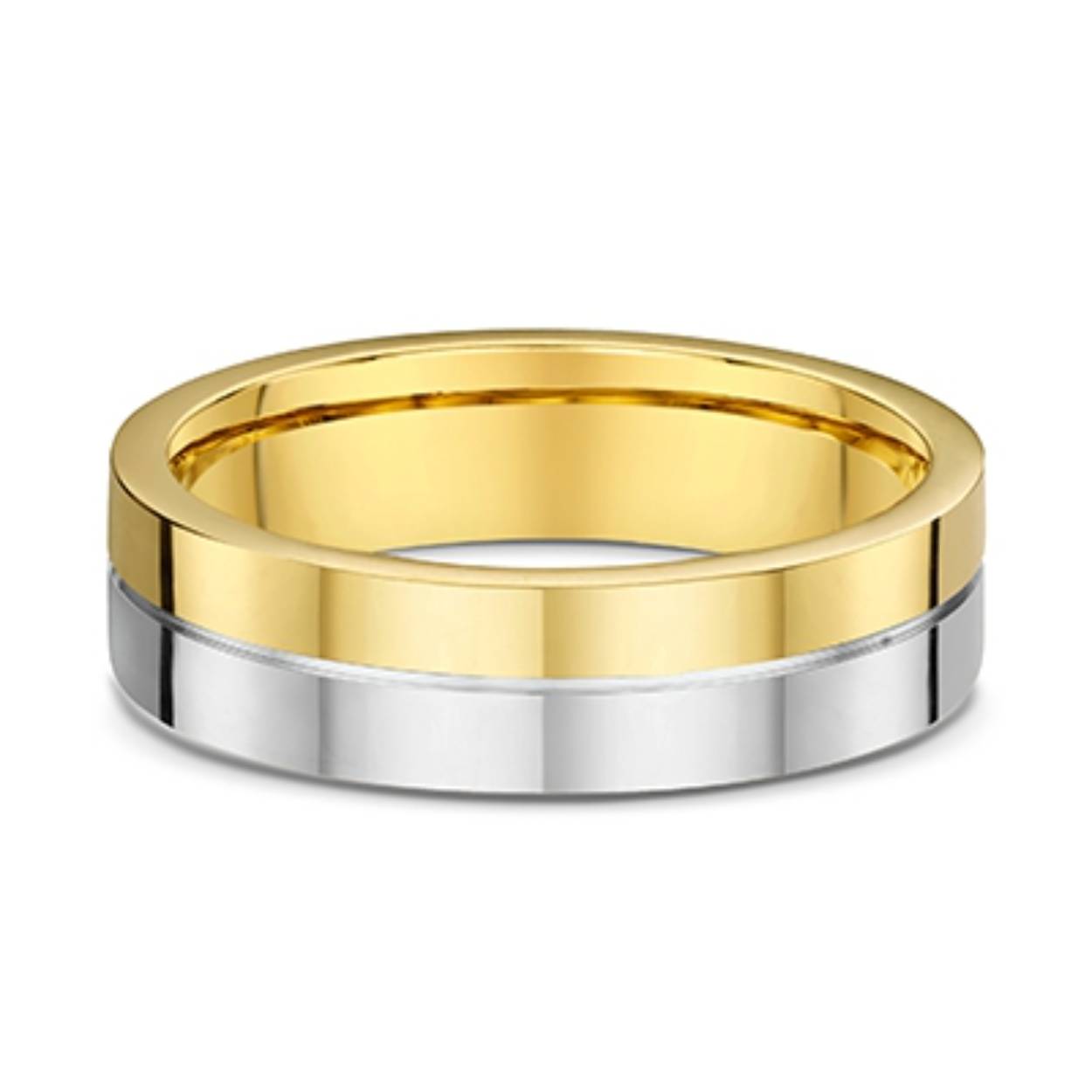 585 bicolor trouwringen geel/witgoud 5 mm breed, glanzend. De damesring is gezet met totaal 0.66 ct briljant 9 steens