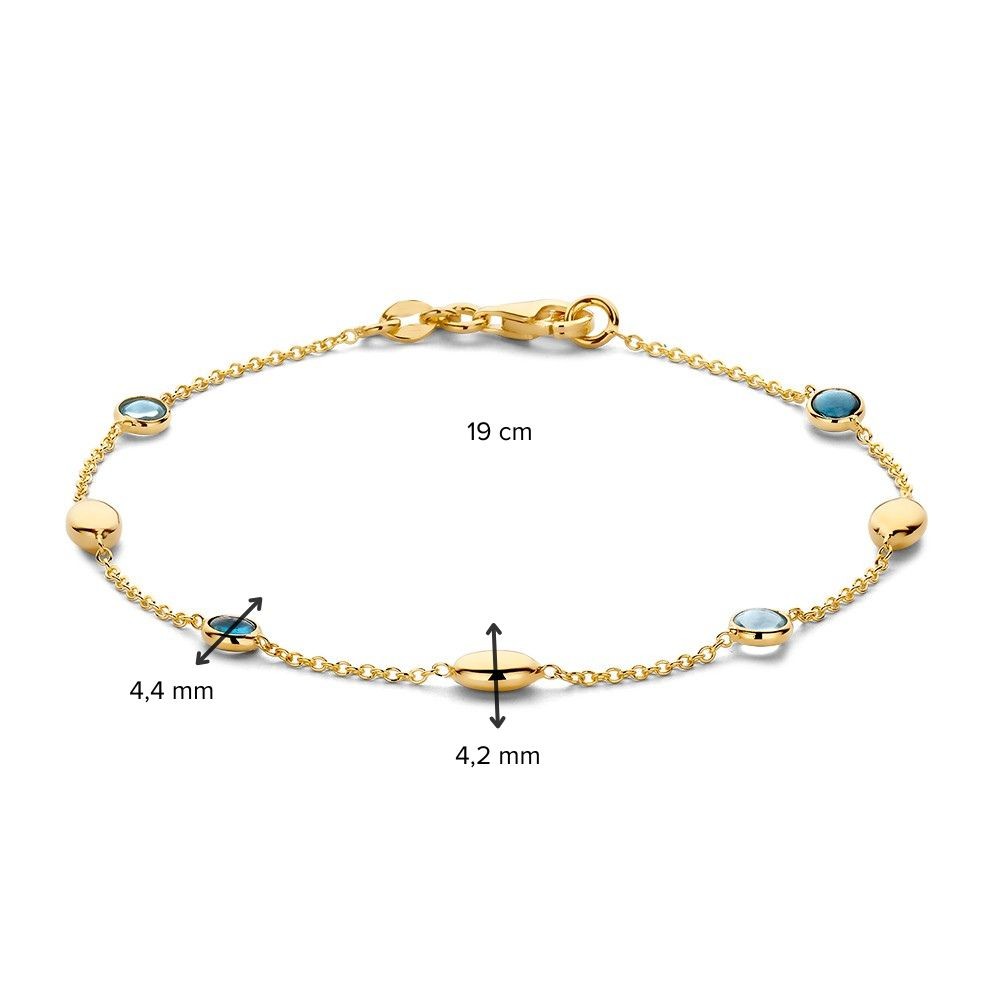 14k Geelgouden armband met blauwe topaas en london blue topaas. De kleurstenen worden afgewisseld met gouden elementen voor een speelse uitstraling.