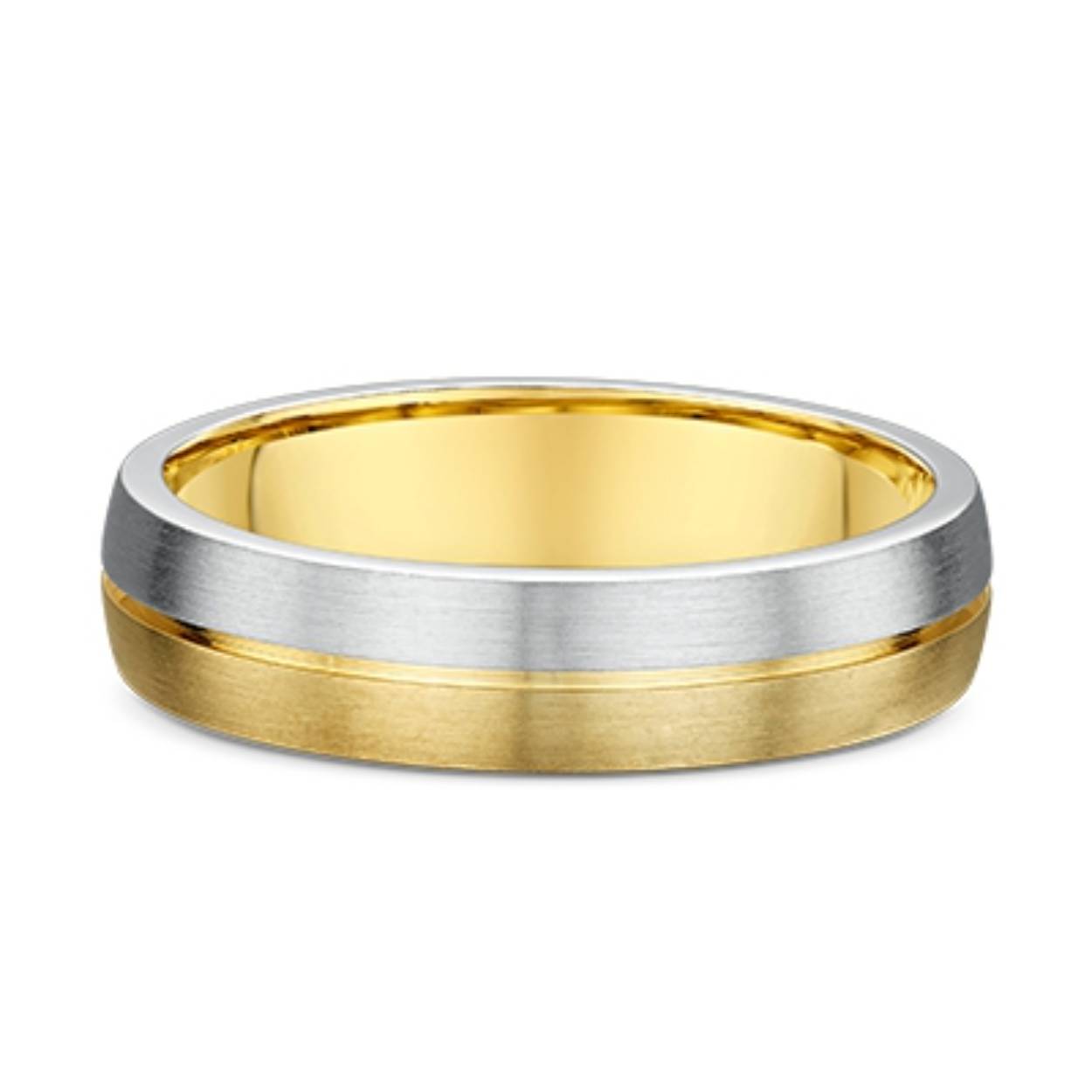 14k gouden bicolor trouwringen. De dames ring is bezet met briljant geslepen diamanten van totaal 0.20ct. De damesring is 5.5mm breed en de herenring is 5mm breed.