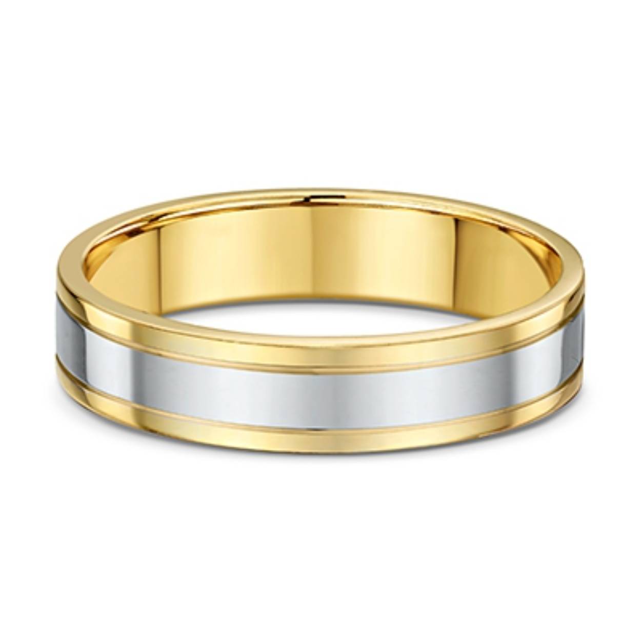 14k bicolor gouden trouwringen. De dames ring is bezet met 9 briljant geslepen diamanten van totaal 0.18ct. Beide ringen zijn 5mm breed.