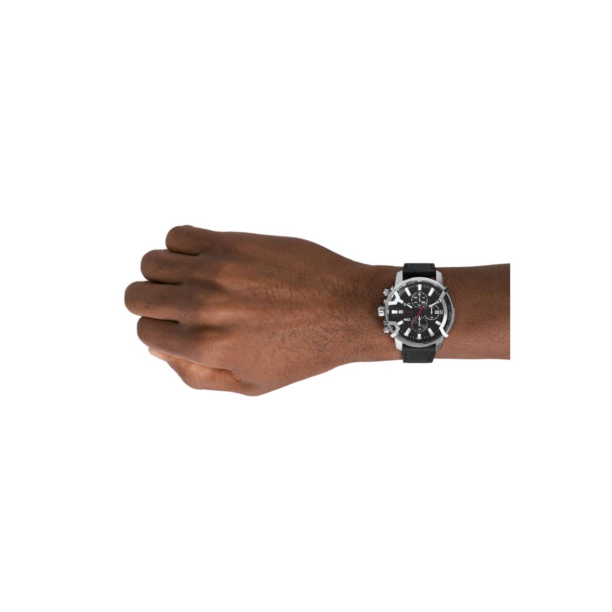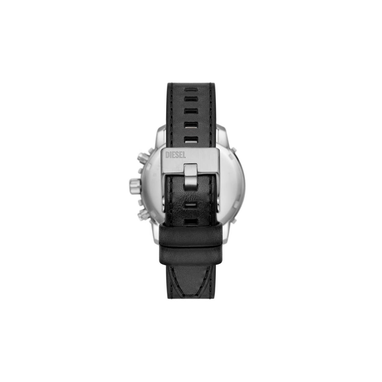 Dit Diesel downsized Griffed horloge van 42�mm heeft een zwarte sunray-wijzerplaat, een chronograaf uurwerk en een zwart leren bandje met zwart leer afkomstig van een LWG-gecertificeerde leerlooierij.