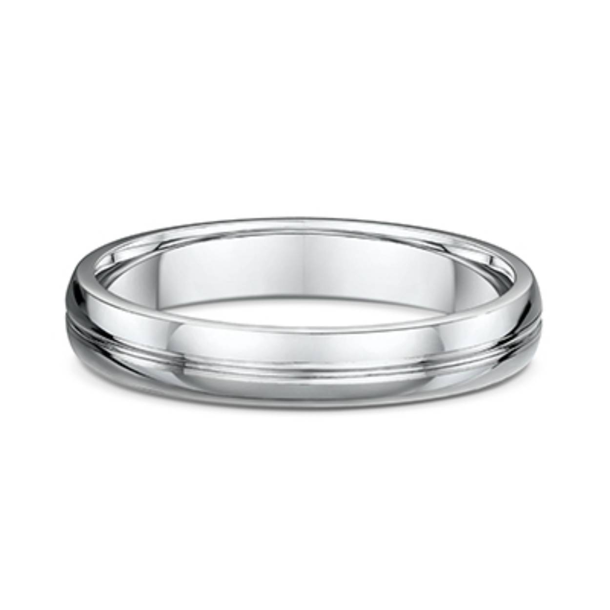 Trouwringen witgoud met in de damesring vijf diamanten. Beide ringen zijn 4 mm breed.