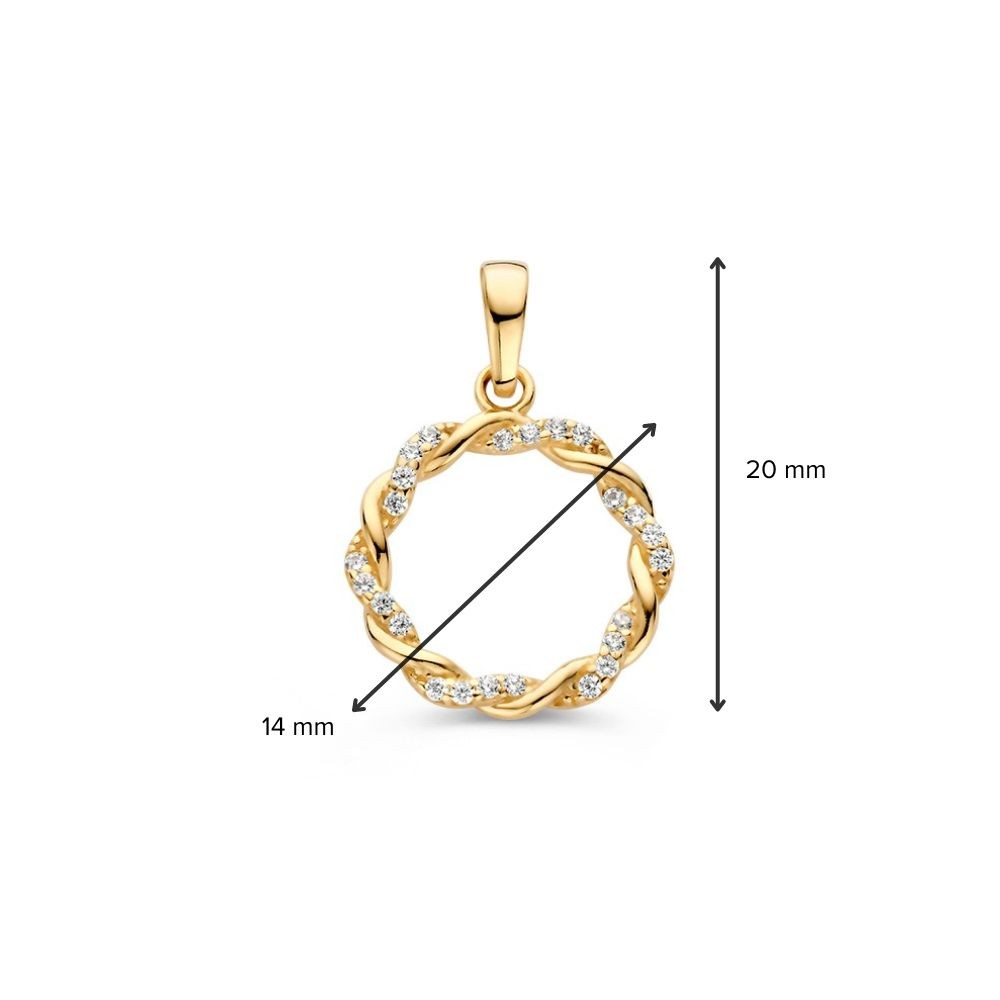 Geelgouden hanger met een gedraaide band in een cirkel. De hanger is gezet met fijne zirkonia's.