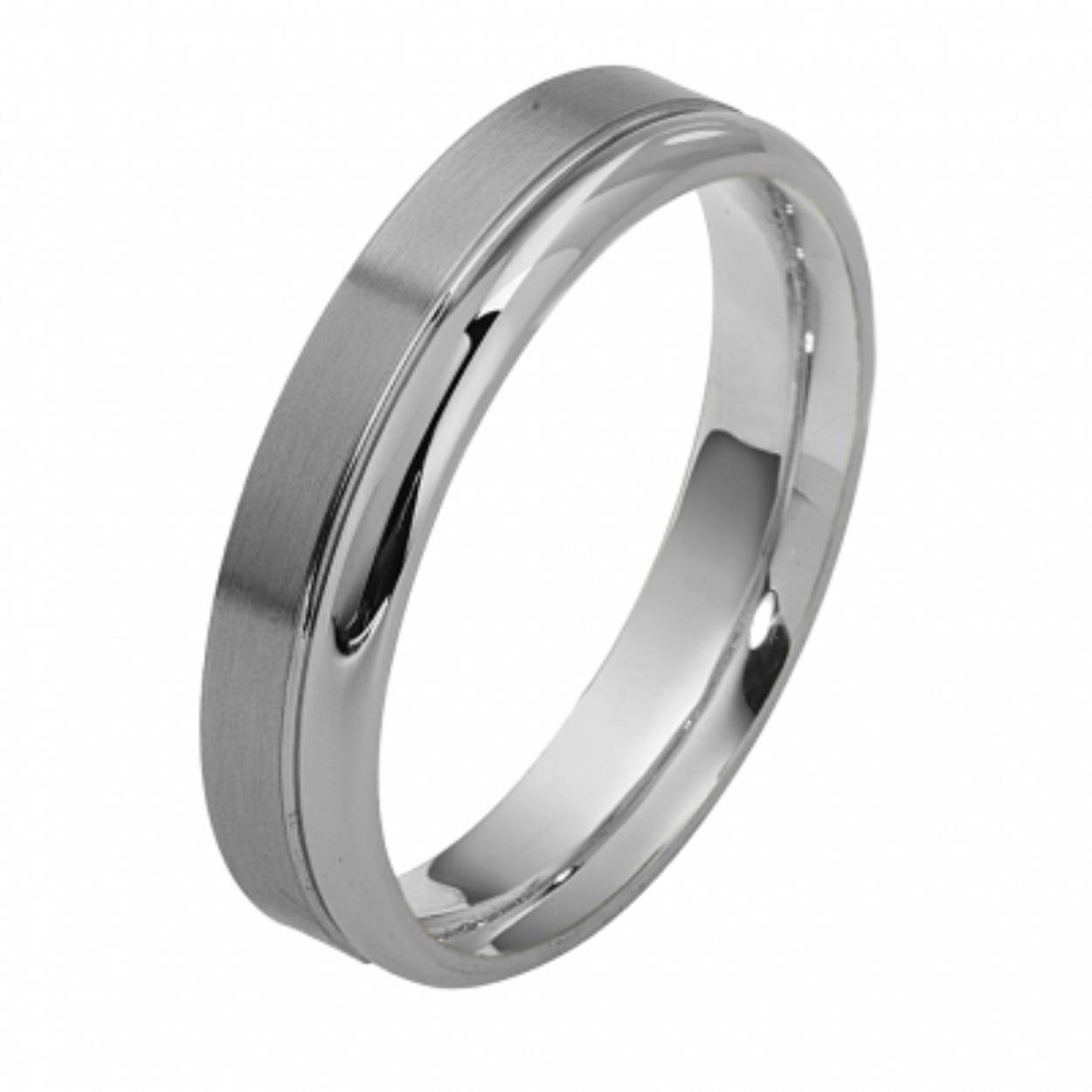 585 witgouden trouwringen, mat/glanzend 4 mm breed. De damesring is gezet met 0.012ct briljant