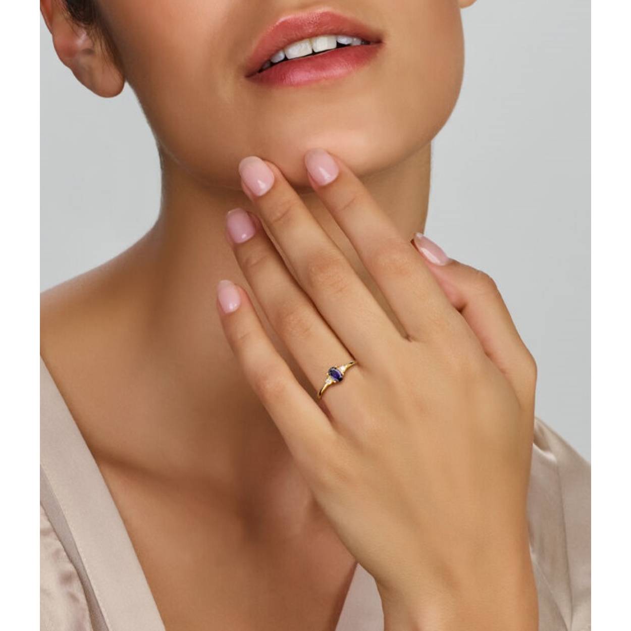 14k Geelgouden ring uitgevoerd met synthetische saffier en zirkonia. De ring heeft een breedte van 6mm.