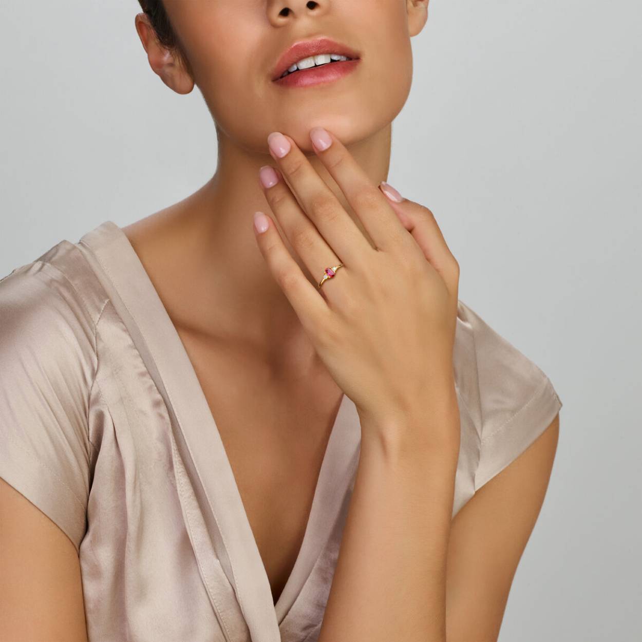 14k Geelgouden ring uitgevoerd met schitterende rode zirkonia in een verbeterde zetting. De ring heeft een breedte van 6mm.